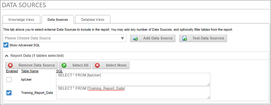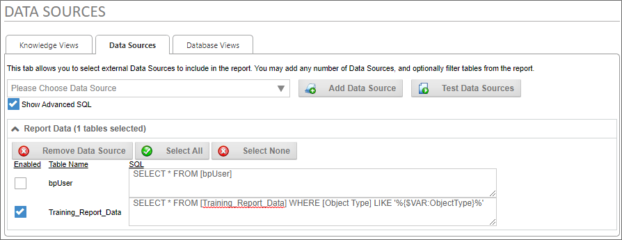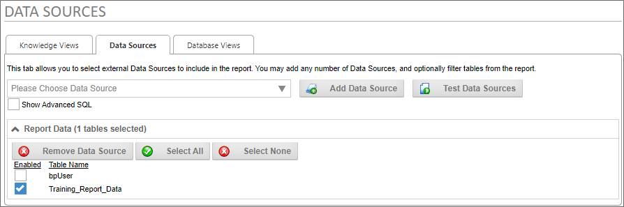 In this case, our datasource returns data from a table named Training_Report_Data. By default, it returns all data in that table, so we'll need to modify this data source to use our variable. To do so, we'll need to check the property labeled, Show Advanced SQL, to edit the SQL statement that returns the data from the table.