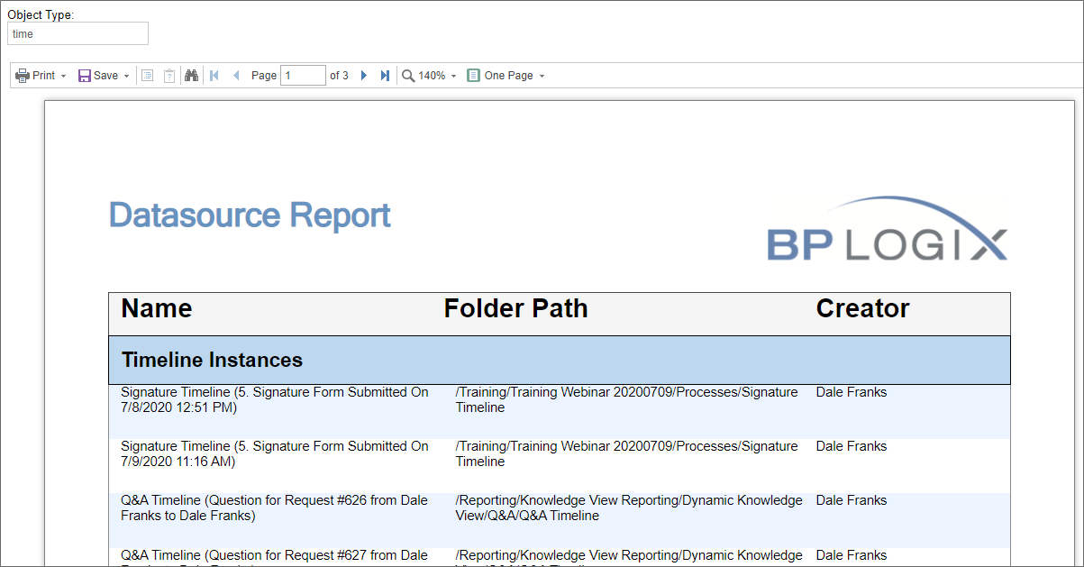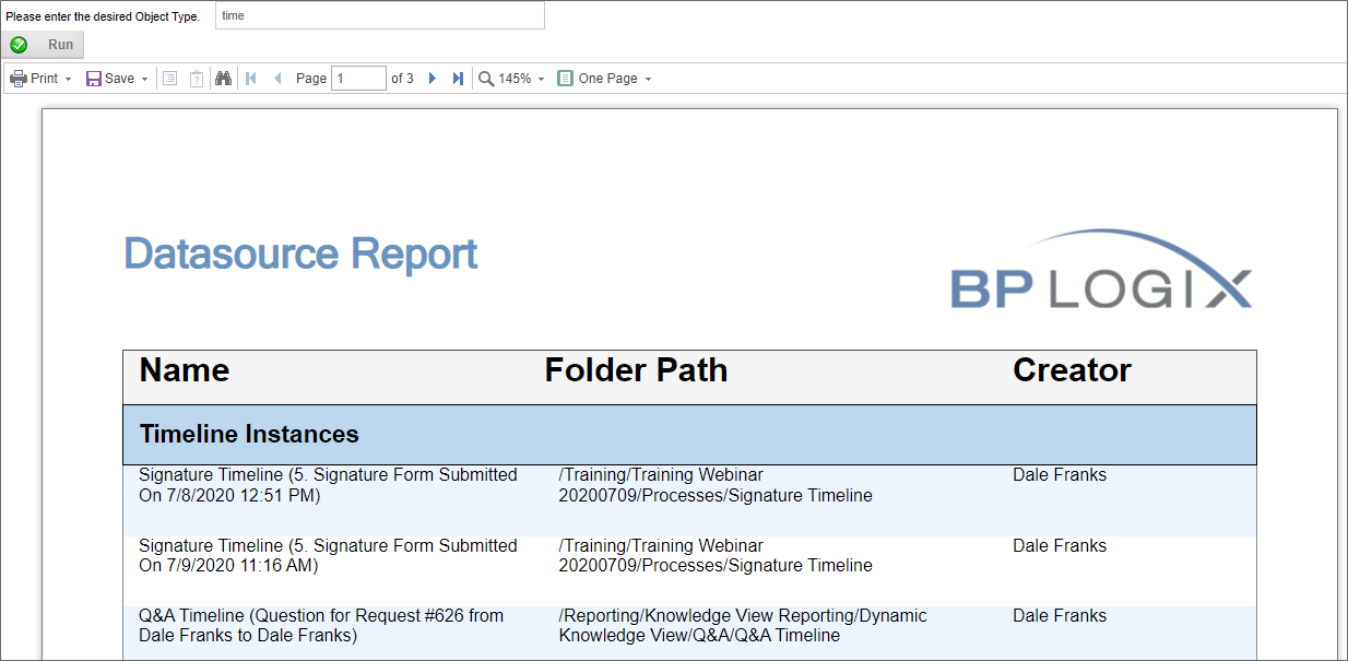 As we can see, the report is now only three pages long, and returns only Timeline instances.