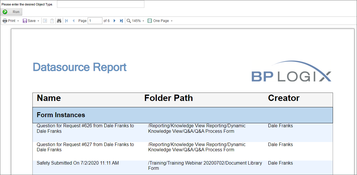 When the Report first opens, no value has been supplied for the ObjectType variable, so the report returns all objects, and is 6 pages long.
