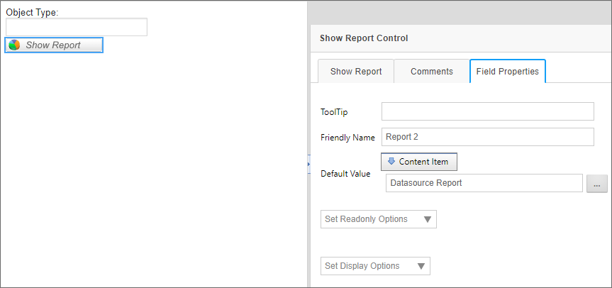 In this simple example, our form has two controls. An Input control named ObjectType, and a ShowReport control named Report2. The ObjectType field is configured as an Event Field, to prompt the report to reload any time we change the field's value. The Report2 field has the Default Value of its Field properties configured to show the Datasource Report definition from the Content Item selection.