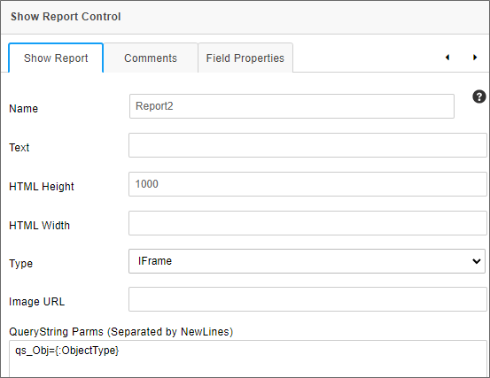 In the QueryString Parms property of the Report2 control, we'll create a query string to pass to the report, using the syntax: