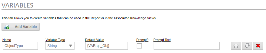 This syntax creates a QueryString named qs_Obj, with a value set to the value of the ObjectType control, via a Form field System Variable. With the QueryString set, we need to configure the Variables tab of the report definition to accept it. So, we'll save and close the Form, open the Report, and edit its Variables tab appropriately.