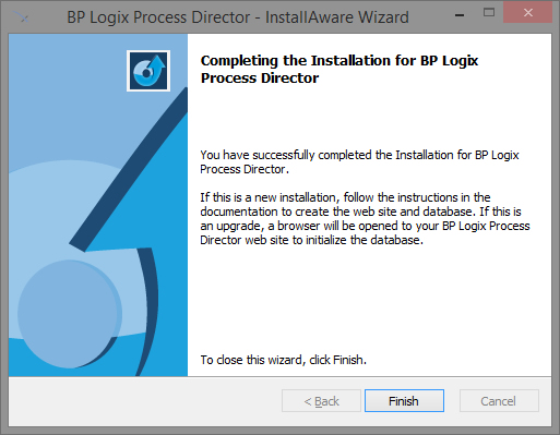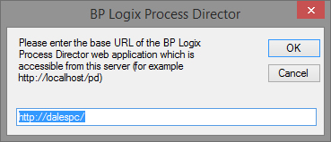 Click the Finish button to close the wizard. After a few seconds, a dialog box will appear to set the base URL for the Process Director installation. By default, this will be the existing URL of the installation, so, you shouldn't have to change the URL. Click the OK button to close and save the URL.