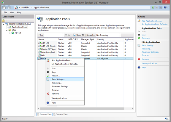 In the Connections pane of the IIS Manager, click on Application pools to display the application pools for IIS in the center pane. Find the application pool you have assigned to Process Director, right-click on it, and select Basic Settings from the popup menu. The basic settings dialog box will open.