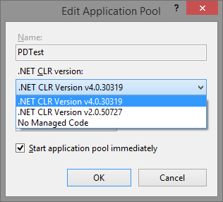 Change the .NET CLR Version dropdown to .NET CLR Version v.4.0.XXXXXX (the precise version will be slightly different depending on the environment, but it should be at least v4.0.30319). Be sure that the Start application pool immediately check box is checked. Click the OK button to save your changes.