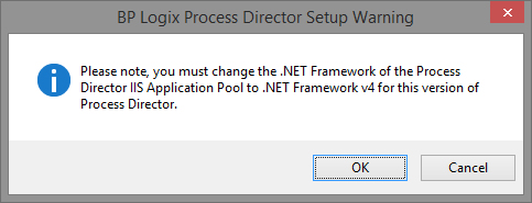 Once the installation files are unpacked and verified, if you are installing v3.4X or above, you'll receive a warning notifying you that you must change the application pool settings in IIS to use ASP.NET v4.5.