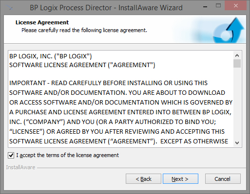 Click the Next button to show the next pane of the Wizard, which displays the License Agreement for Process Director. To continue the wizard, you must accept the terms of the license agreement by checking the acceptance check box.