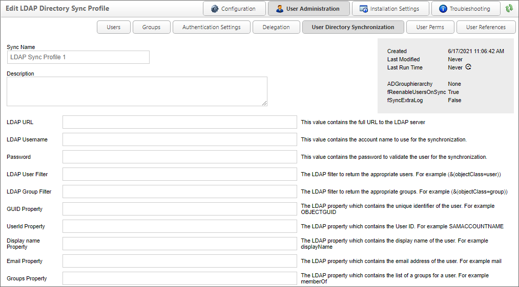 This utility can be run manually, or scheduled to perform an automatic synchronization. To perform the synchronization, navigate to User Administration > User Directory Synchronization. Each sync configuration is a profile. Each profile will, after running, display when the synchronization was last performed, and the result of the synchronization.