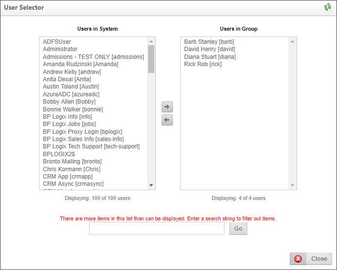 A User Selector window will appear. Select the users that you want to add to the group from the Users in System pane, then click on the arrow that point to the right to add the selected users to the Users in Group pane. To remove a user from a group, select the users from the Users in Group pane and click on the arrow button that points to the left.