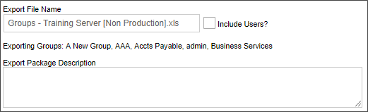 Built-in Groups can be exported between systems using Excel files. To export groups, select one or more groups from the Group List, then click on the Export Groups action link. An export box will appear that enables you to specify the name of the Excel file to which the list of selected users will be exported. A default name will be provided, but you can edit the default, at your discretion.