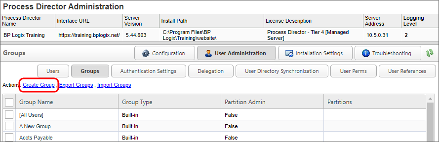 Process Director supports groups. A group provides a collection of users according to organization, geographic location, role, or any other type of categorization. Any permissions or task assignments that can be given to an individual user can also be given to a group. Group administration can be accessed via the Groups page, which is located in the User Administration section of the IT Admin area.