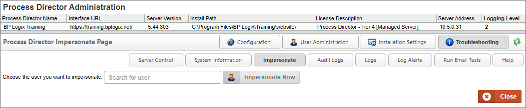 For Cloud installations, or on-premise installations that use the Compliance Edition or Subscription licenses, Process Director allows some users to impersonate other users. Impersonation allows a user to act as another user, seeing and completing the tasks to which he is assigned, leaving his name on routing slips when doing so, etc. Impersonating a user is almost exactly the same as being logged in as that user, except that the impersonation will appear in the audit log. This feature is useful to assist users with problems they are having, or to debug problems you can't replicate with another user.