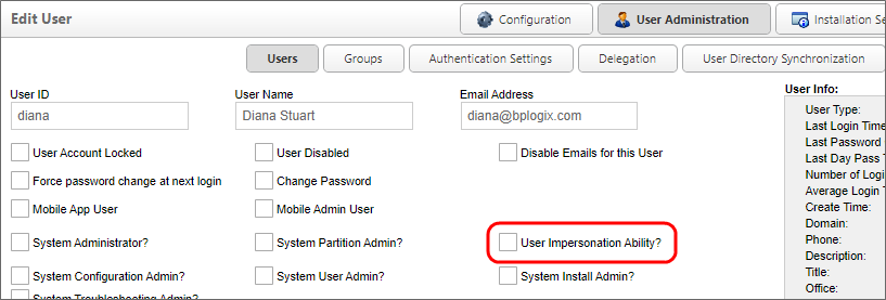 To grant a user the ability to impersonate other users, navigate to the User Administration section of the IT Admin area, access the Users page, and click on the user whom you'd like to grant the ability. When the user's profile opens, you'll see a checkbox that says User Impersonation Ability?. Check the box.