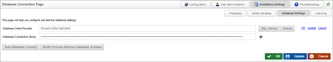 For Process Director v6.0.100 and higher, the header text, Database Connection Page, has been changed to Database Settings, to match the page name specified on the navigation button.