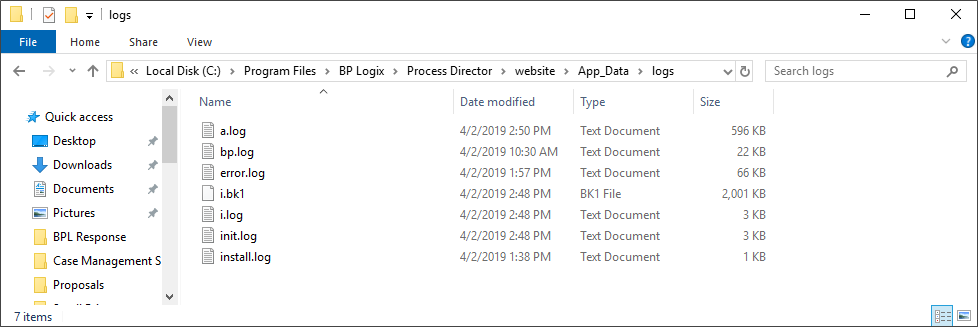 The most recent log files are available for view in this page's log reader. All of the log files are also available from within your Process Director installation in the %InstallationDirectory%\website\App_Data\logs folder.