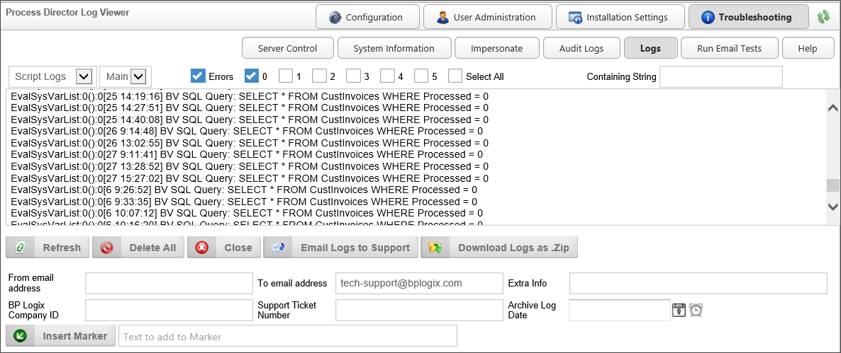 On occasion, you may run into issues that you requires assistance from BP Logix to debug. In those cases, a technical support representative may ask you to attach your log files to your technical support ticket. In this case, there is a button located below the log reader that is labeled Email Logs. Below this button, you'll see text boxes into which you can enter email addresses to which to send the logs from your Process Director installation. In addition, there is a text box for you to enter other information you'd like to appear in the text of your email. If these are filled out correctly, you can click the Email Logs button to send the logs in a zipped file.
