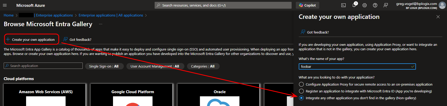 Click the Create your own application button, then select the option labeled, Integrate any other application you don't find in the gallery.