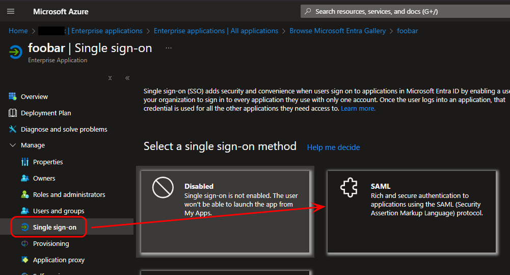 Once the application has been created, you'll need to select the application type. To do so, click the Single sign-on button from the navigation bar on the left side of the page, then click the SAML button that will appear in the main portion of the screen.