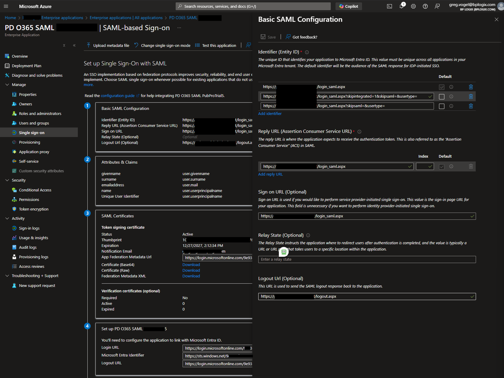 On the SAML-based Sign-on page, you'll need to add the appropriate identifying URLS to configure the linkage between Process Director's SAML-related pages and Azure/Entra.