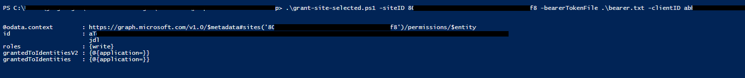 .\grant-site-selected.ps1 -siteID <SharePoint Site ID> -bearerTokenFile .\bearer.txt -clientID <Site Client ID> -appName "Site"