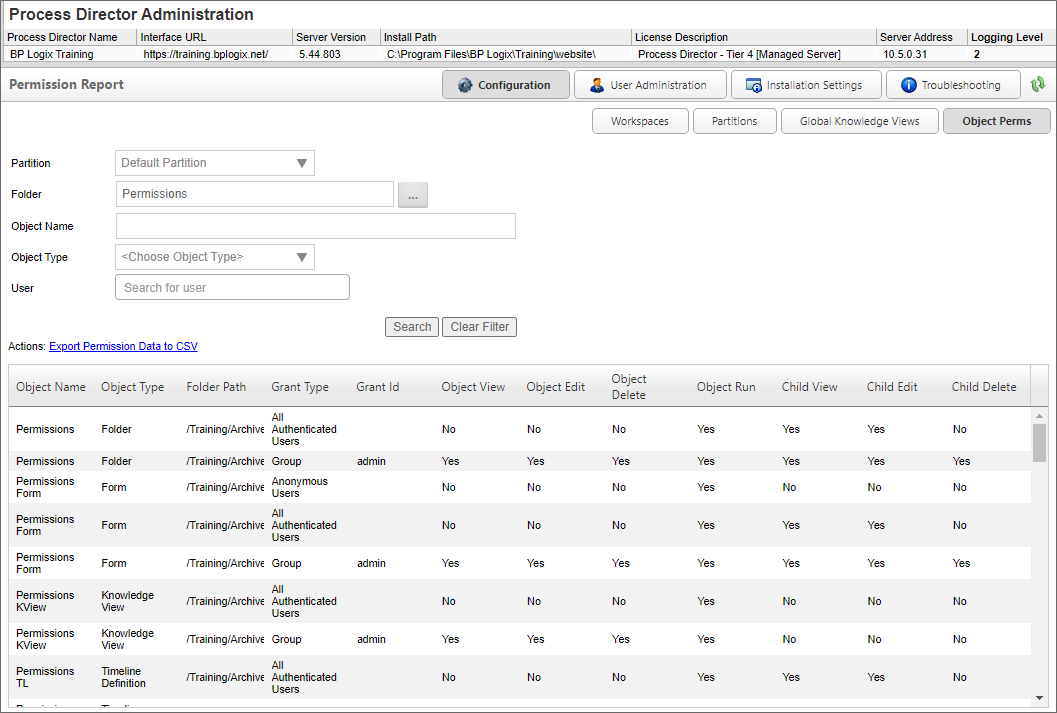 Administrators of Subscription, Cloud, or on-Premise installations with the Compliance Option will notice an additional Object Perms button in the IT Admin interface. Process Director provides a searchable report of all object permissions on the Object Perms page.