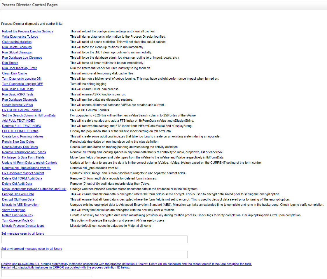 The Server Control page enables you to run various tests and cleanups to ensure that Process Director is running properly. Most of the server control items are self-explanatory, but a few require a bit more elaboration.