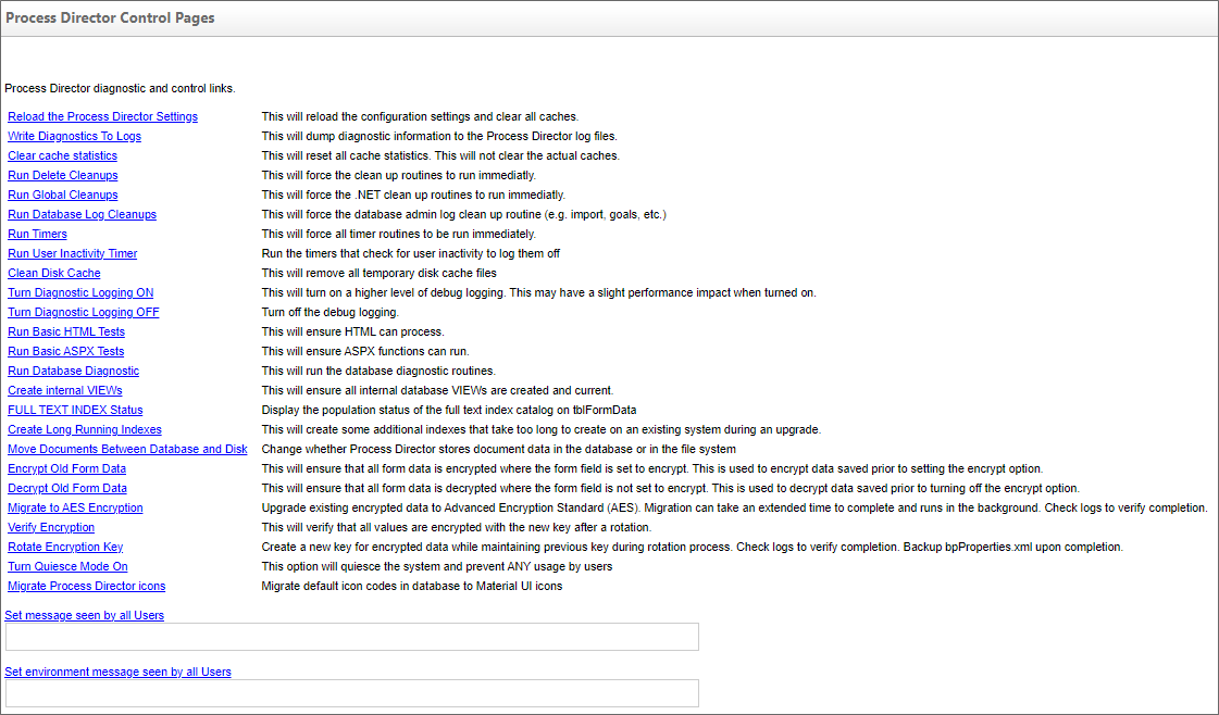 The Turn Quiesce Mode On link will disable Process Director for end users, but not administrators. Quiesce mode enables administrators to make changes to the Content List, import applications, and do other administrative tasks, while preventing non-administrative users from accessing Forms or other objects. This function is useful for making administrative changes that might disrupt users. When turning Quiesce Mode on, you can also provide a message using the Set message seen by all Users link to notify them that some administrative activity is in progress, and their access to the system is temporarily suspended.