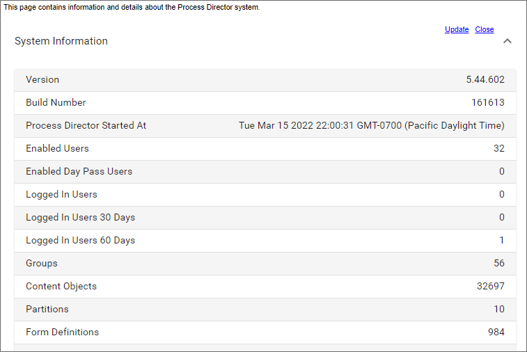 The System Information page displays information regarding the number of objects and users on this installation of Process Director, characteristics of the hard drive that Process Director is installed on, and licensing information.