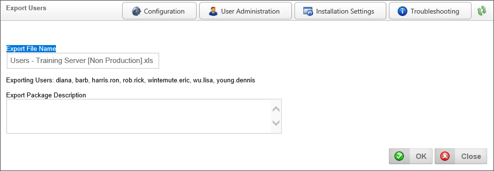 To export users, select one or more users from the User List, then click on the Export Users action link. An export box will appear that enables you to specify the name of the Excel file to which the list of selected users will be exported. A default name will be provided, but you can edit the default, at your discretion.