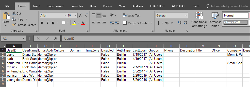 Similarly, you can use your own Excel or CSV file to import new users. If you are importing users via your own Excel or CSV file, you must, as a minimum, have a UserID column for each record, but BP Logix recommends that you have the following columns in your file, with the appropriate data for the users in each row: