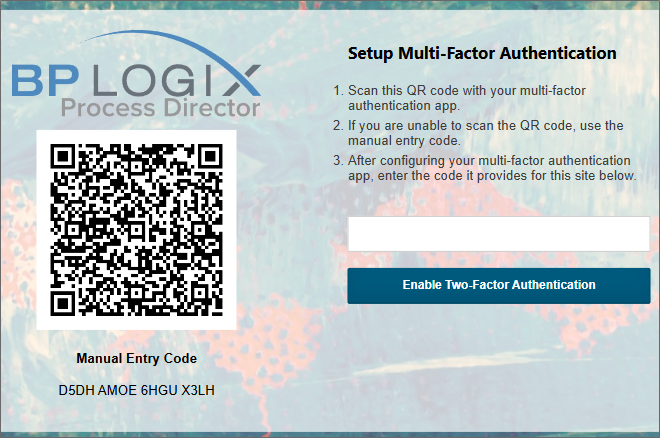 The activation screen displays a QR code that, when scanned in the user's authentication app, will create an MFA account for the Process Director installation. (A manual MFA entry code is also displayed below the QR code to manually enter into the authenticator app, if needed. Generally the authentication app simply enables you to scan the QR code.)