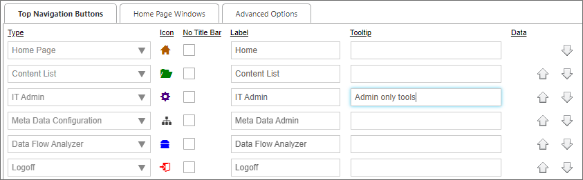 Specify the navigation buttons to display at the top of the Homepage. Specify the type of button, the name of the button and optional icon, and if any, the additional configuration for the button. You can also specify the tooltip that displays when the user mouses over the button, as well as in what order the button appears in the navigation bar.