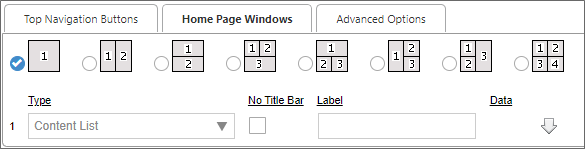 Specify the Homepage Windows by selecting the window template and associate a type for each window. Each line will correspond with the window number. Each window can be defined to display different content.