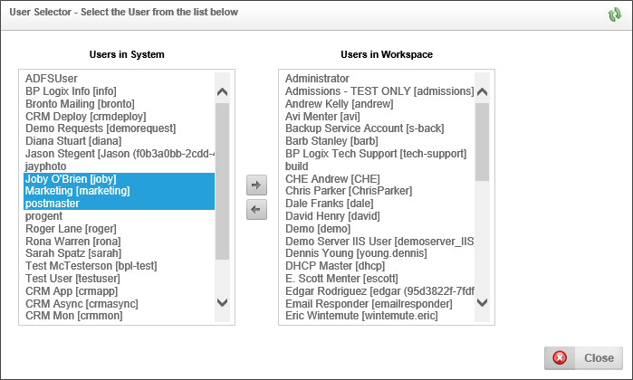 Clicking on the Assign Users button will open the User Selector dialog box, which enables you to select users to assign to the workspace.