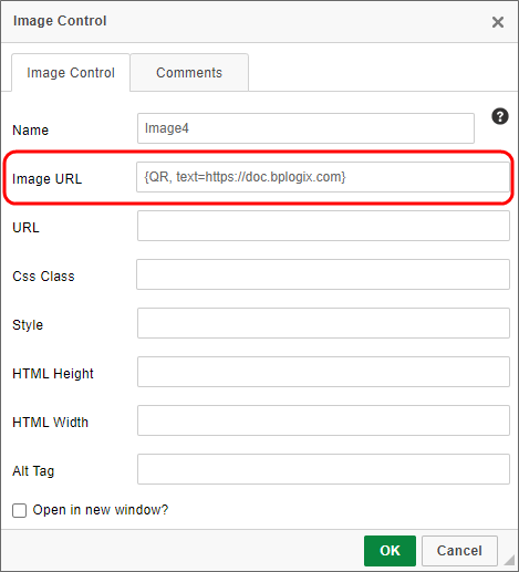 text: This is a required text parameter that specifies the text that should be encoded into the QR Code. This parameter will usually be the URL of a web page. System variables can be used to construct the text modifier.